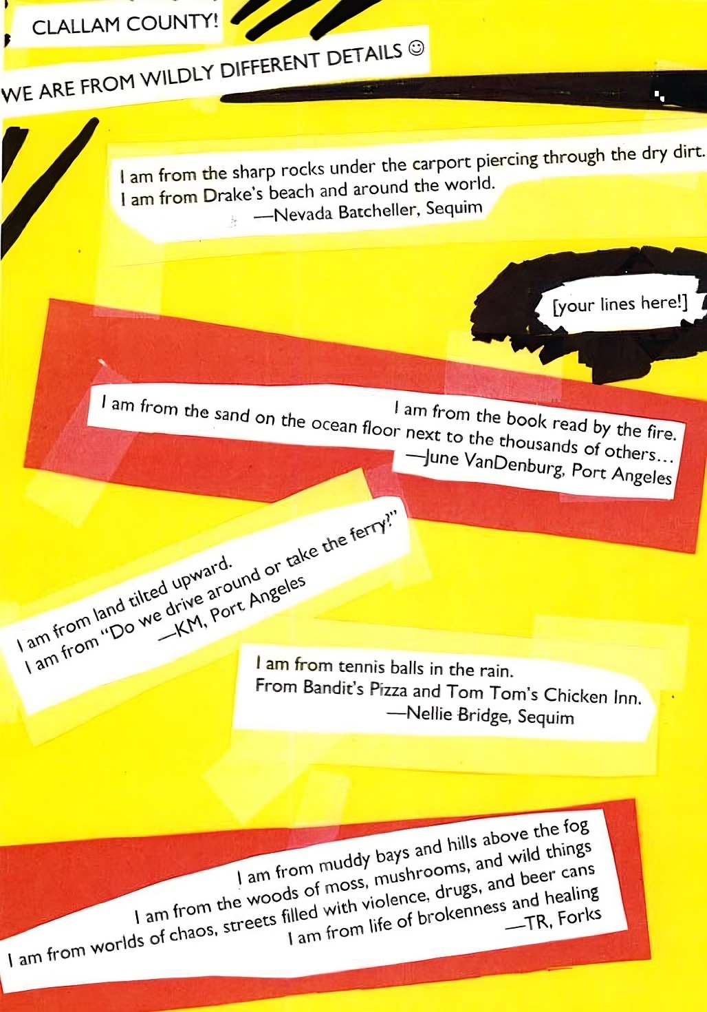 Begin each line, sentence, or just every now and then with “I am from…” followed by a specific detail, name, smell, words that echo, or other important specific item from your life. The details do not need to come from Clallam County. There aren’t actually any rules, but specificity and realness are key.